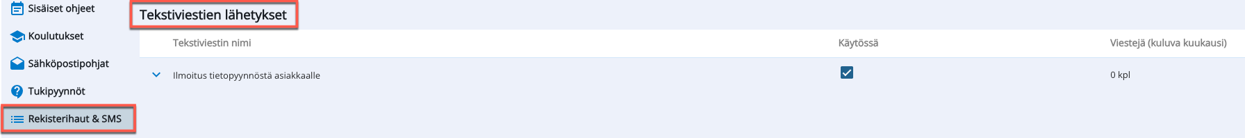 (Rekisterihaut & SMS > Muut maksulliset transaktiot >Tekstiviestien lähetykset > Ilmoitus tietopyynnöstä asiakkaalle)