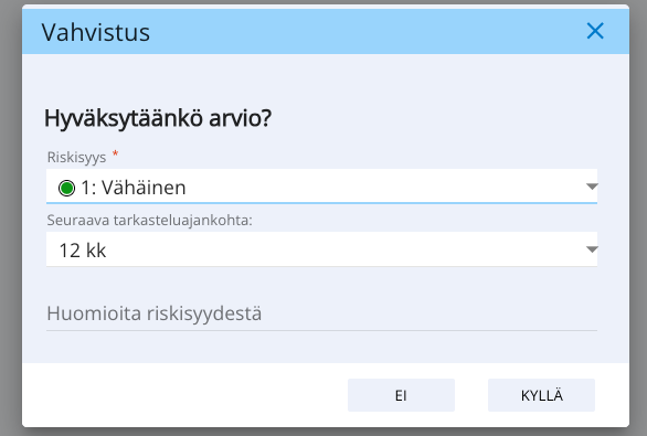 Klikkaamalla "Hyväksy arvio" jälkeen voidaan määritellä asiakkaan tarkasteluväli (3-36 kuukautta), riskitaso (vähäinen, tavanomainen, korkea) sekä kirjata huomioita asiakkaan riskisyyteen liittyen. Yksityisasiakkaalla on vain kaksi riskitasoa: tavanomainen ja korkea. Merkinnät tulevat näkymään Jatkuvassa seurannassa.