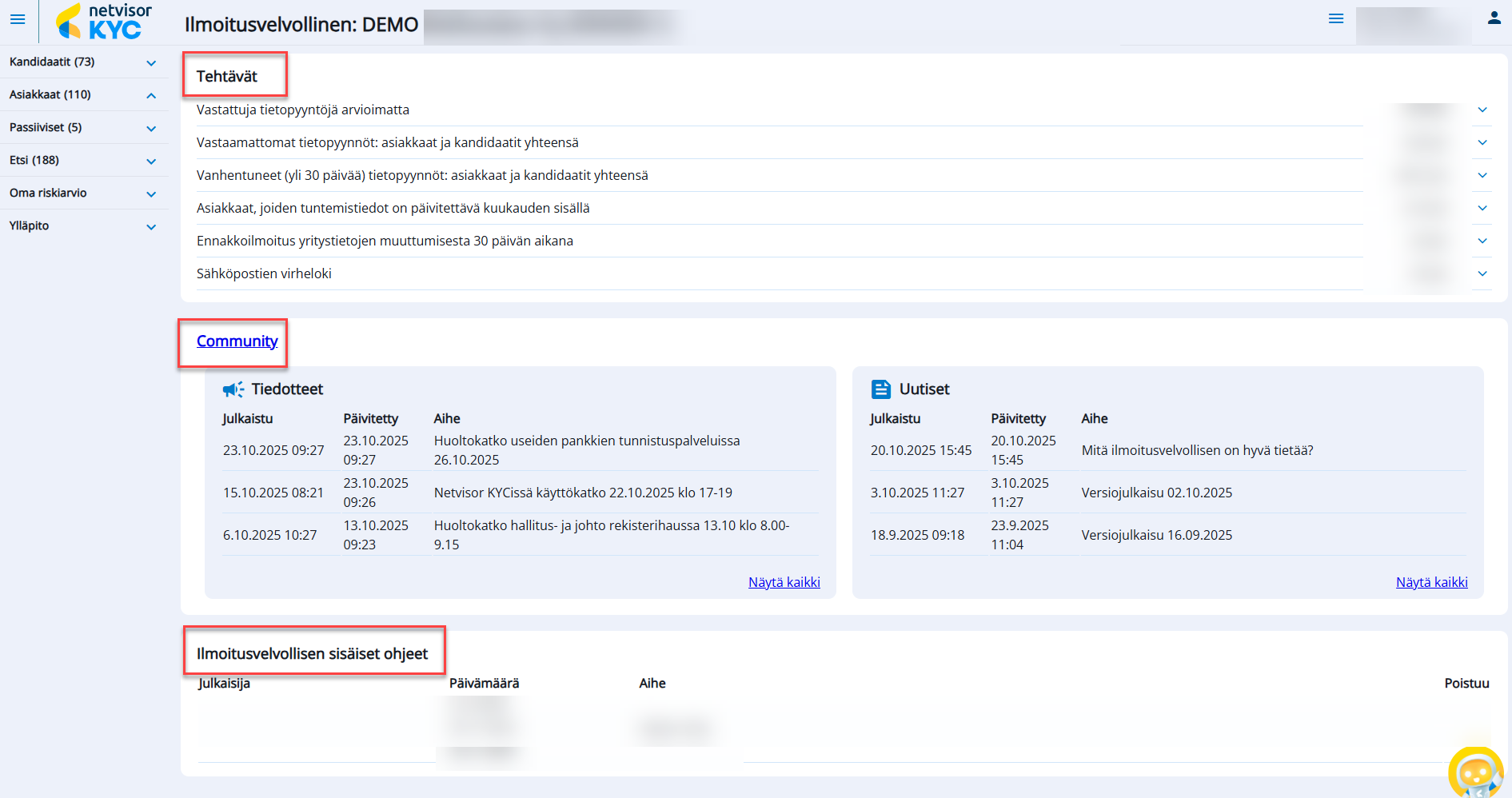 Netvisor KYC:n etusivulla on kootusti listattuna avoimia tehtäviä eri osa-alueittain: