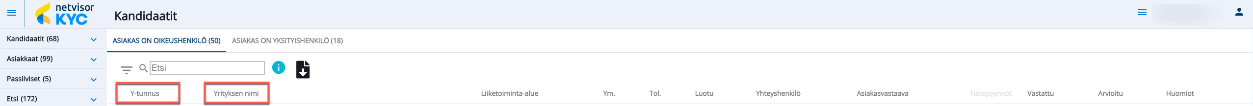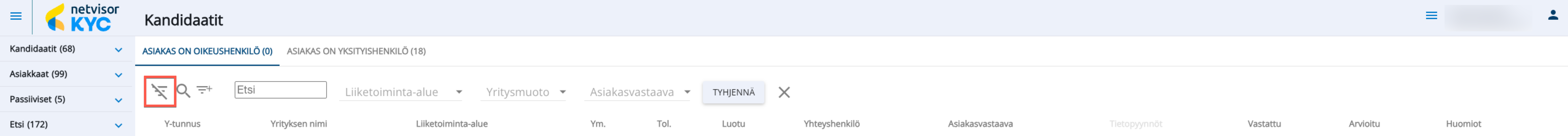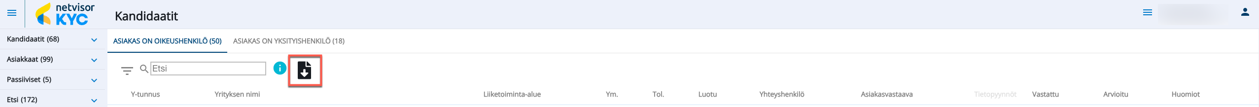 Kandidaatit osiossa on listaus yrityksistä ja yksityishenkilöistä, joita ei olla vielä hyväksytty asiakkaaksi.