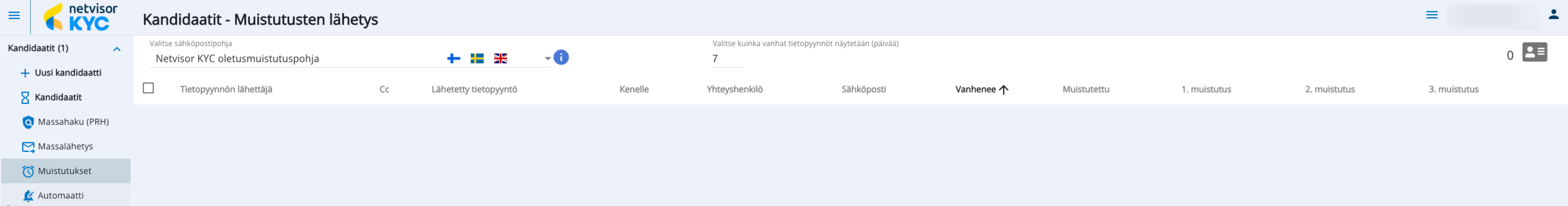Muistutuksia vanhenemassa olevista tietopyynnöistä voi lähettää massana tai yksittäin niin ”Kandidaatit”- kuin ”Asiakkaat”- valikostakin. Sähköpostipohjana käytetään oletuspohjaa tai ylläpidosta vanheneville tietopyynnöille valittua muistutussähköpostipohjaa.