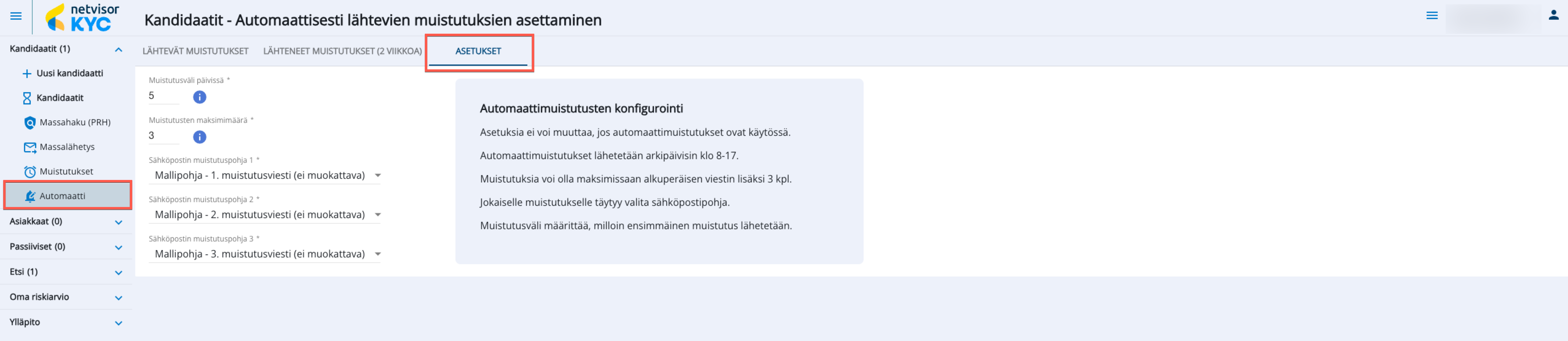 Huomaathan, ettei asetuksia voi vaihtaa automaattimuistutuksen ollessa päällä.
