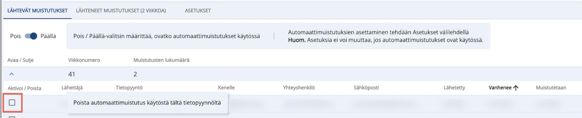 Voit merkitä listalta tietopyynnöt mistä et halua lähtevän automaattimuistutusta: