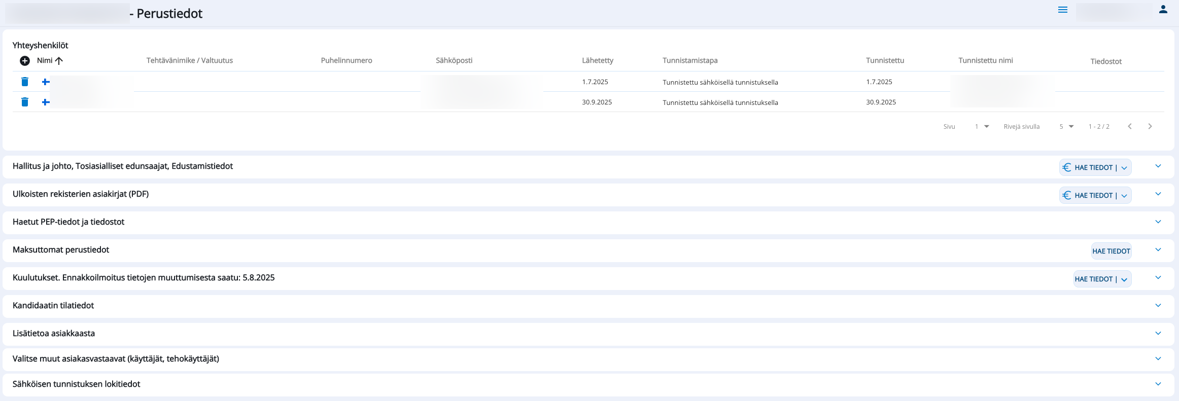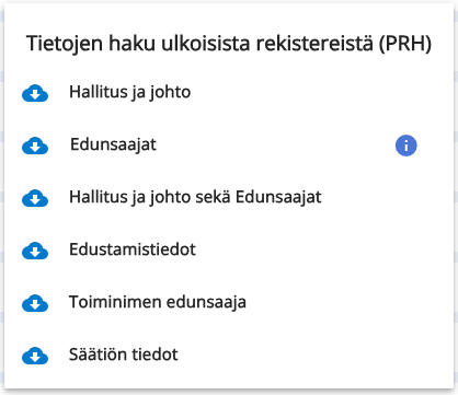 Yrityksen tosiasialliset edunsaajat, hallituksen jäsenet ja muut johdon henkilötiedot voidaan hakea ulkoisesta rekisteristä tai täyttää manuaalisesti tietopyynnölle, ennen kuin tietopyyntö lähetetään kandidaattiyrityksen yhteyshenkilölle. Mikäli käyttäjä päivittää tietopyynnön esitäytettyjä tietoja, päivittyvät ne myös asiakkaan perustietoihin sen jälkeen, kun tietopyyntö on arvioitu. Kaikki muutokset edunsaajatietoihin tallennetaan historiatietoihin. Historiatiedot saadaan näkyviin klikkaamalla "Näytä historia".