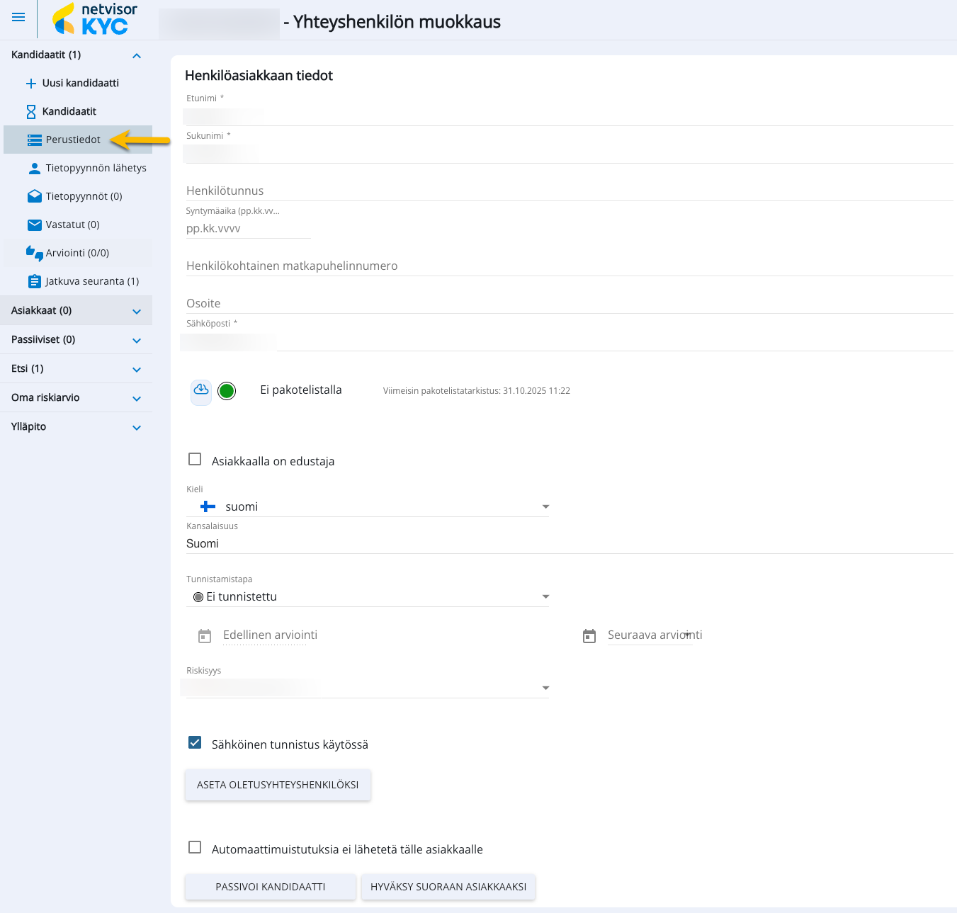 - Voit kirjata henkilöasiakkaan tunnistamis-/todentamistavan vetovalikosta.