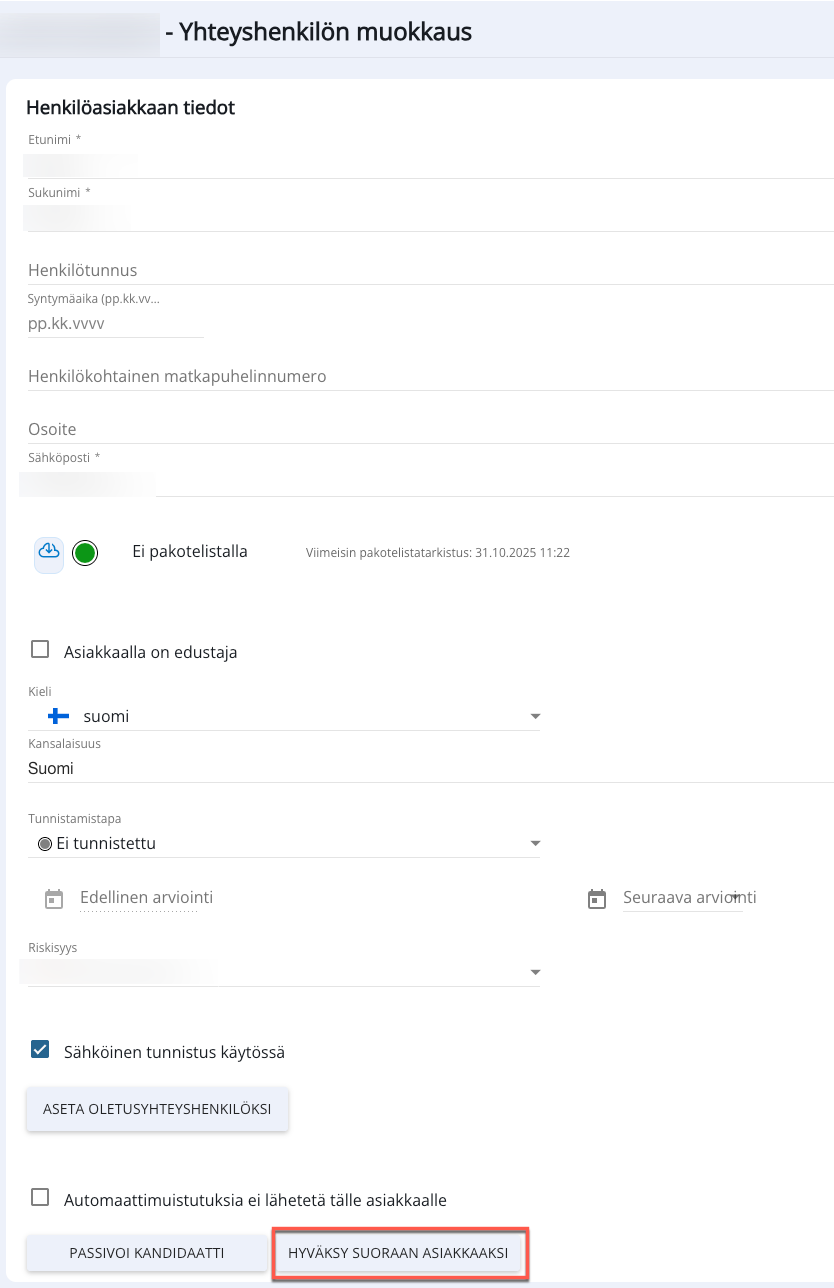 Kandidaatin voi hyväksyä järjestelmässä suoraan asiakkaaksi ilman tietopyynnön lähettämistä. Hyväksyntä suoraan asiakkaaksi tapahtuu valitun kandidaatin perustiedoista osiosta "Kanditaatin tilatiedot". Suositeltavaa kuitenkin on hyväksyä kandidaatti asiakkaaksi ensimmäisen tietopyynnön arvioinnin yhteydessä, täten ilmoitusvelvollinen pystyy luotettavammin varmistumaan tuntemistietojen ajantasaisuudesta.