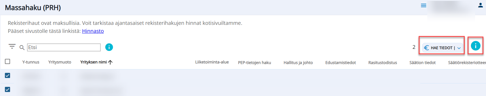 PRH-rekisterissä olevia tietoja voidaan hakea useammalle asiakkaalle kerralla ”Kandidaatit”- ja ”Asiakkaat” -valikosta. Näin tietopyynnöille saadaan esitäytettyjä tietoja ja tietopyyntöjen manuaalinen käsittely helpottuu. Klikkaa ensin Massahaku (PRH), valitse halutut yritykset listalta ja oikean yläkulman painikkeesta voit suorittaa haun. Massahaulla voidaan etsiä seuraavia tietoja: