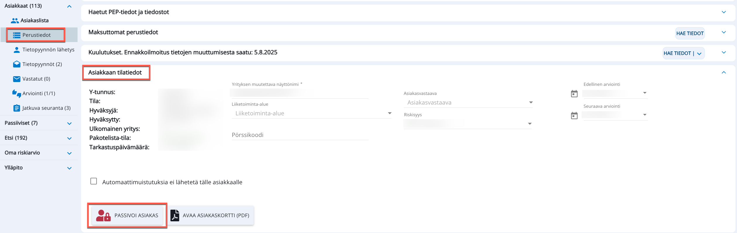 Asiakassuhteen päättyessä asiakas merkitään passiiviseksi perustiedoista (Perustiedot > Asiakkaan tilatiedot). Tietosuojaperiaatteita noudattaen järjestelmä säilyttää passivoitujen asiakkaiden tietoja vähintään viisi vuotta. Järjestelmä muistuttaa viiden vuoden jälkeen passivoitujen asiakastietojen poistamisesta. Passivoitu asiakas voidaan myös myöhemmin aktivoida uudelleen. Passivoituja asiakkaita voi tarkastella kohdasta Passiiviset > Asiakkaat.