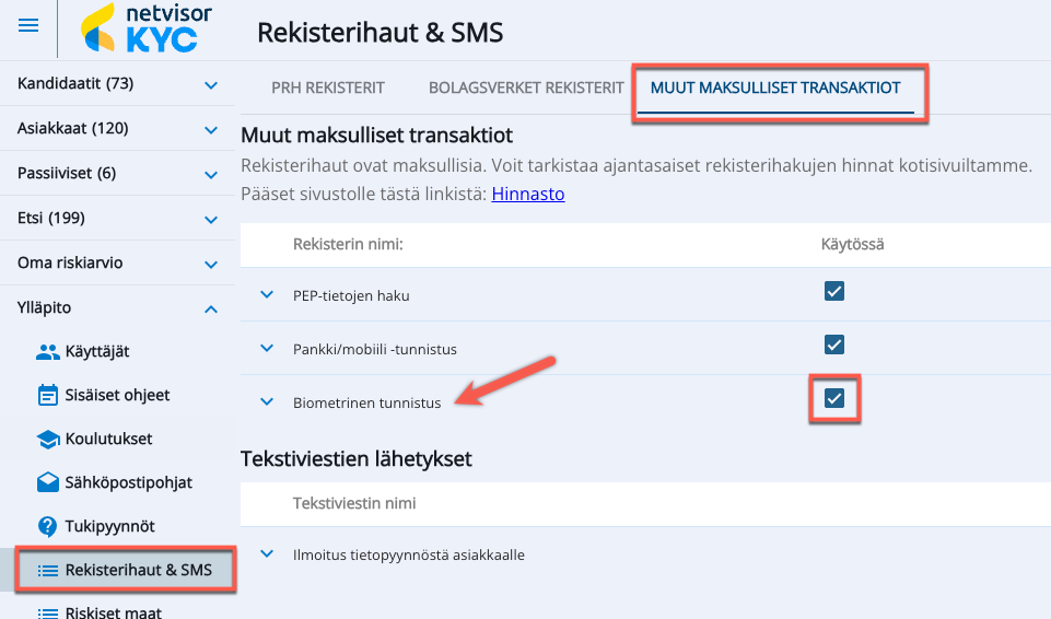 Biometrinen tunnistus on valinnainen maksullinen lisäpalvelu Genius paketeissa. Pääkäyttäjä voi kytkeä sen päälle ohjelmasta kohdasta Ylläpito > Rekisterihaut & SMS > Muut maksulliset transaktiot > Biometrinen tunnistus.